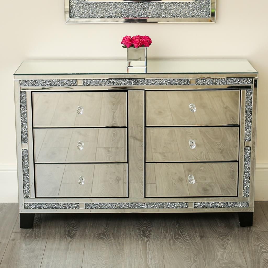 Our 6-drawer mirrored chest featuring beautiful crushed diamonds on the front panels. The drawers are equipped with crystal handle knobs for added charm and practicality. The chest is finished in an elegant silver glass color.