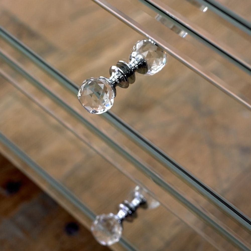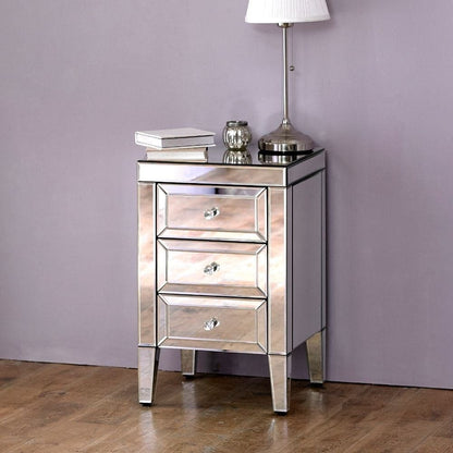 The Valencia 3 Drawer Bedside table features 3 smaller size drawers for your personal items. Your bedside lamp, picture frame or any decorative item would look wonderful on the reflecting top of the table. The drawers pull out smoothly and feature beautiful circular crystal effect handles to make the furniture even more stunning.